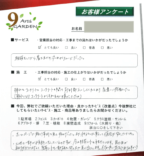 全体的にコンクリートを敷くだけの工事の感じと思っていましたが、見積もりで所々にワンポイントを入れてもらい仕上がりの見た目が全然変わりセンスの良さを感じました。
