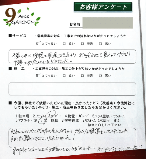 ・ホームページで施工事例を見て好みだった。また他社と比較して値段が安かったため。